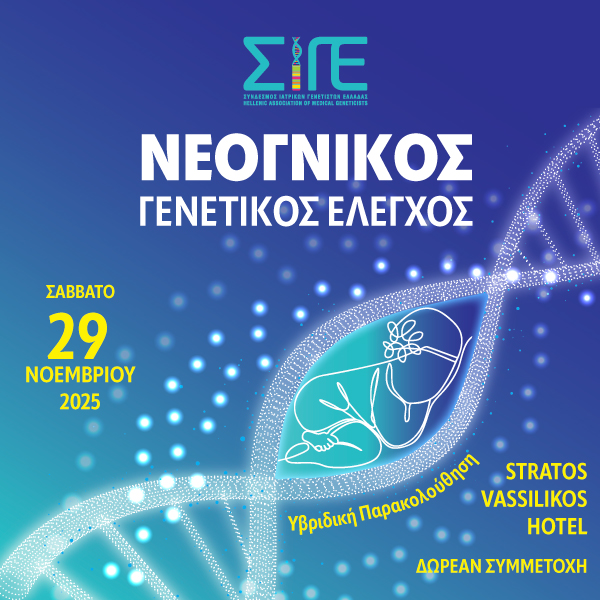 Ο Σύνδεσμος Ιατρικών Γενετιστών Ελλάδος (ΣΙΓΕ) διοργανώνει ημερίδα με θέμα «Νεογνικός Γενετικός Έλεγχος» με στόχο